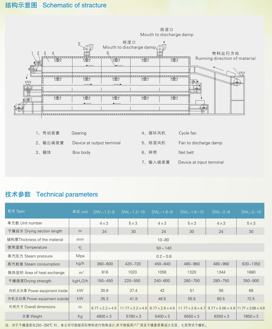 DW系列多层带式干燥机是成批生产用的连续式干燥设备,用于透气性较好的片状、条状、颗粒状物料的干燥,对于脱水蔬菜、催化剂、中药饮片等类含水率高、而物料温度不允许高的物料尤为合适;该系列干燥机具有干燥速度快、蒸发强度高、产品质量好的优点,对脱水滤饼类的膏状物料,需经造粒或制成条状后方可干燥。