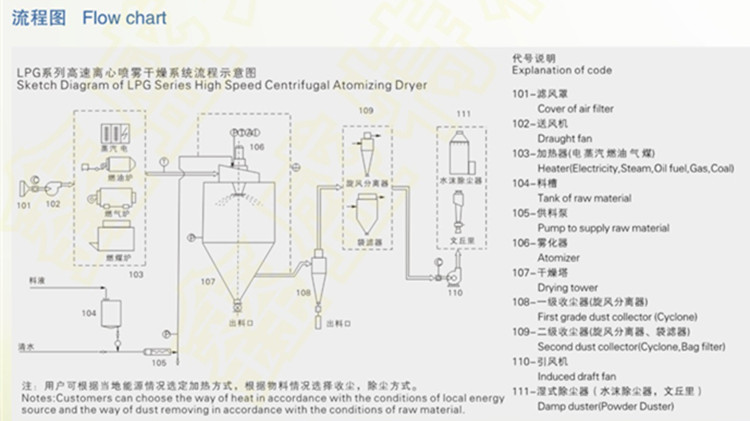 空气经过过滤和加热,进入干燥器顶部空气分配器,热空气呈螺旋状均匀地进入干燥室。料液经塔体顶部的高速离心雾化器,(旋转)喷雾成极细微的雾状液珠,与热空气并流接触,在极短的时间内可干燥为成品。成品连续地由干燥塔底部和旋风分离器中输出,废气由风机排空。